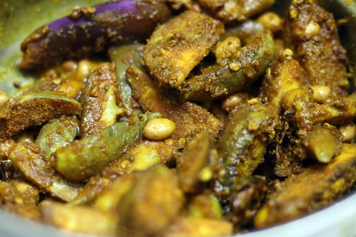- Add coconut bits and saute well till color changes. Add peanuts, chopped brinjal and saute well.