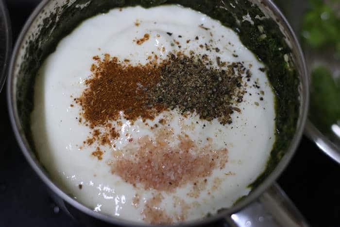 - Add 1 cup plain thick yogurt to a medium bowl. Whisk yogurt very well first. Add it to the mint paste. Now add 3/4 teaspoon rock salt, freshly cracked black pepper powder, roasted cumin powder and chaat masala powder.